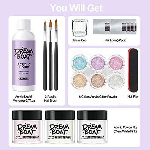 Acrylic Nail Package for Newcomers Clear White Pink Acrylic Powder Monomer Acrylic Nail Liquid 6 Colours Glitter Powder 3Pcs Nail Brushes Nail Types for Acrylic Utility Nails Extension Set