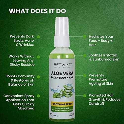 Betwixt Aloe Vera Spray (Face + Physique + Hair) Soothing & Non-Sticky – Infused with Inexperienced Tea – Free from Synthetic Thickeners – After Solar Care & Sunburn Aid, Pure Moisturizer – 100 ml / 3.38 fl (Pack of two)