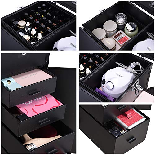 Byootique Rolling Manicure Desk Nail Desk Workstation with 4 Drawers Mirror Speaker Make-up Salon Journey Beauty Trolley Storage Organizer Black