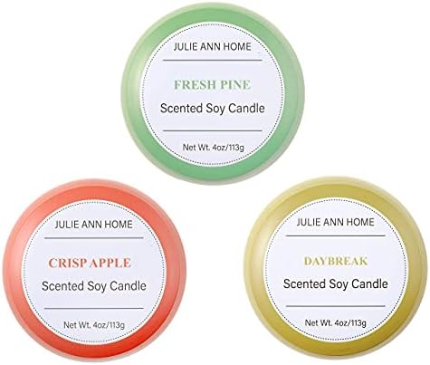 Candle Present Set of three Scented Soy Candles | 4oz Pure Soy Wax Poured into Ornamental Steel Tins with Lids | Assorted Pack of three Fall Aromatherapy Fragrances – Crisp Apple, Recent Pine, Dawn