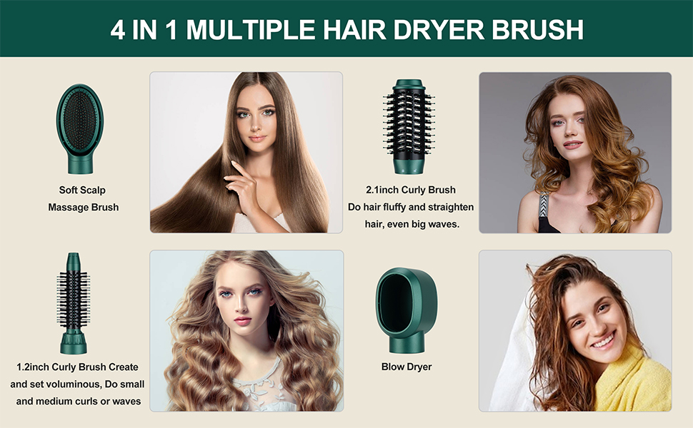 🎁MULTIFUNCTIONAL HAIR DRYER BRUSH: 4 in 1 sizzling air brush equipment embody 1x blow dryer, 1x comfortable scalp therapeutic massage brush head, 1x 2.1inch and 1x 1inch curly hair brush head, used as a hair dryer, volumizer and roller, simple to make use of, environment friendly and time saving for hair styling instruments.