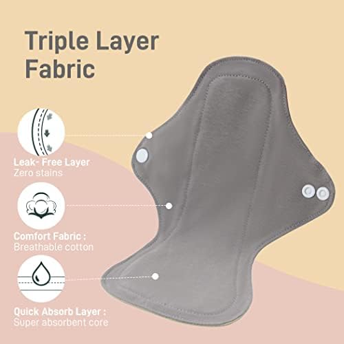 SOFT AND ABSORBENT MATERIAL: 3/4/5 layers materials design of this reusable sanitary pads, make certain consolation in addition to absorbency, inside layer fabricated from cotton cloth layer towards your pores and skin, tremendous mushy and have a keep dry floor, center layers are super-absorbent microfiber, Fold over and snap into place.