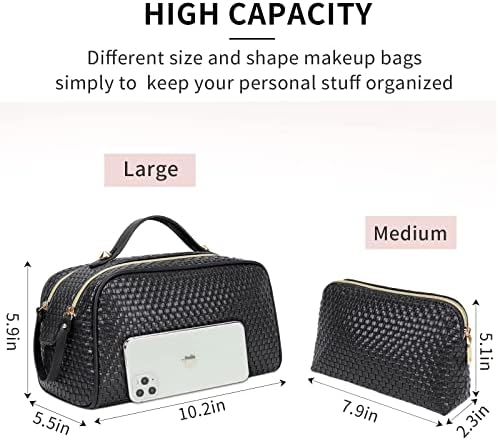💄【Additional Massive Capability】The make-up bag set has 2 completely different shapes and sizes. The big make up bag(10.2″L x 5.5″W x 5.9″H)is massive sufficient to accommodate varied cosmetics and toiletries, and the medium make-up pouch(7.9″L x 2.3″W x 5.1″H) can maintain some small objects. Good make-up bag units to maintain your make-up merchandise organized and show you how to to avoid wasting the house