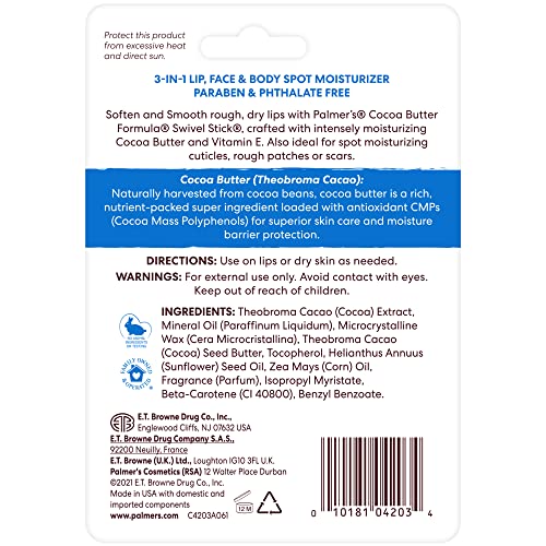 Palmer’s Cocoa Butter Components Swivel Stick supplies on-the-spot assist for marks and blemishes and is good for touch-up moisturizing on face and physique.