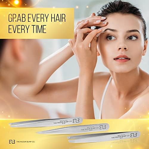 Razor Bump Co. Tweezer Set, Made in USA, 3-Piece Artisan Tweezers for Eyebrows and Ingrown Hair Removing – Pointed Tweezers and Slant Tweezers Handcrafted of Rustproof, Non-Irritating Stainless Metal