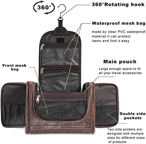 SOLIMIC Hanging Toiletry Bag for Males & Girls PU Leather-based Dopp Package Journey Shaving Bag Moveable Toiletries Equipment Organizer Massive Capability Beauty Bag with Sturdy Metallic Hook (Darkish Brown)