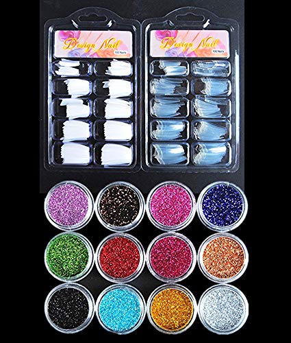 12 Glitter acrylic powder creating stunning nail for lengthy lasting sparkle nail ideas. Two acrylic nail tip used as nail acrylic package for nail artwork starter to DIY nail artwork design.